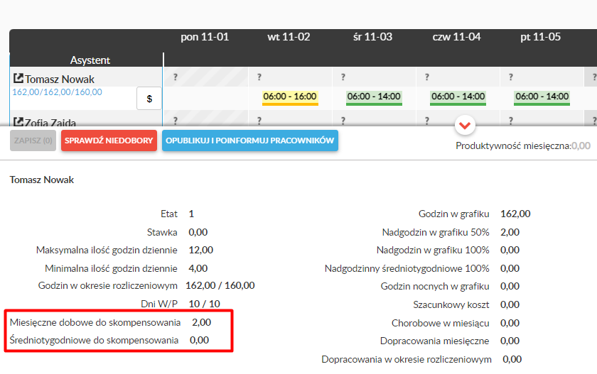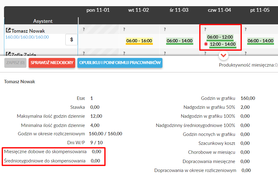 Po kliknięciu w imię i nazwisko pracownika, a następnie w czerwoną strzałkę wyświetli się podsumowanie. W podsumowaniu pojawi się także informacja o liczbie powstałych nadgodzin w danym grafiku oraz liczbie nadgodzin do skompensowania w danym miesiącu: