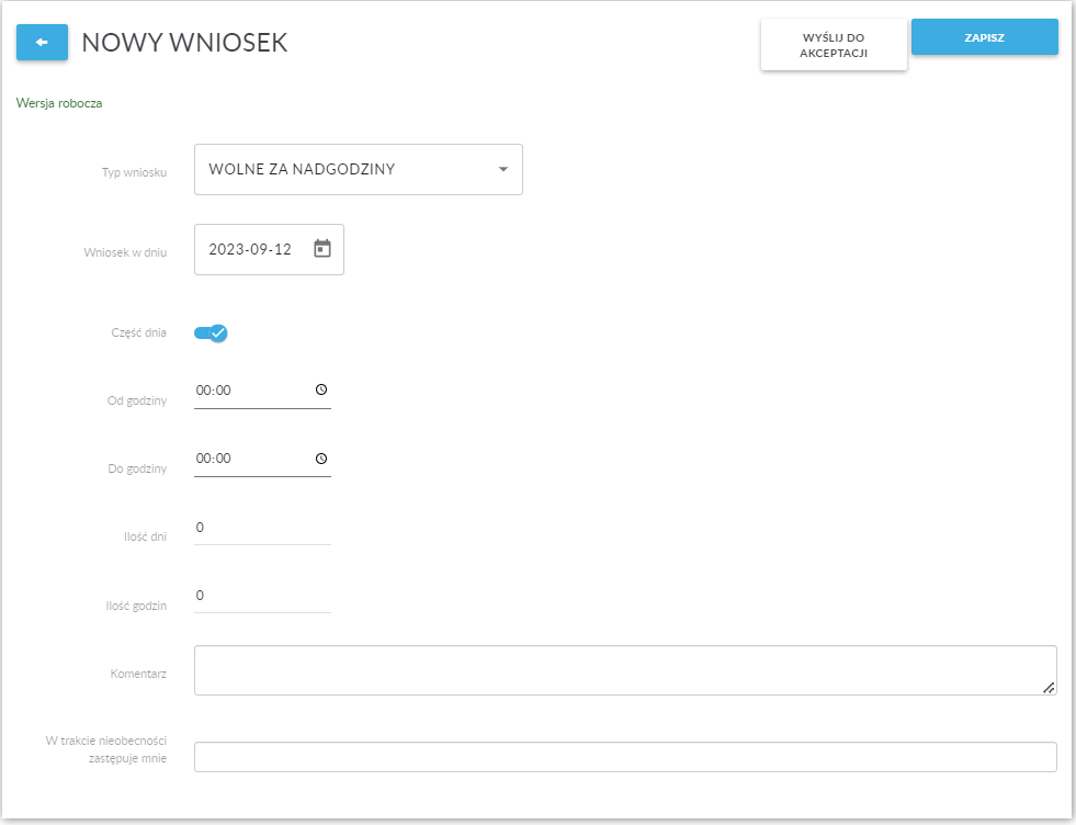 Uzupełniony wniosek z kompensatą 1:1 wysyłamy do akceptacji. Trafi on do bezpośredniego przełożonego, a po jego akceptacji kompensata automatycznie naniesie się na grafik pracy.