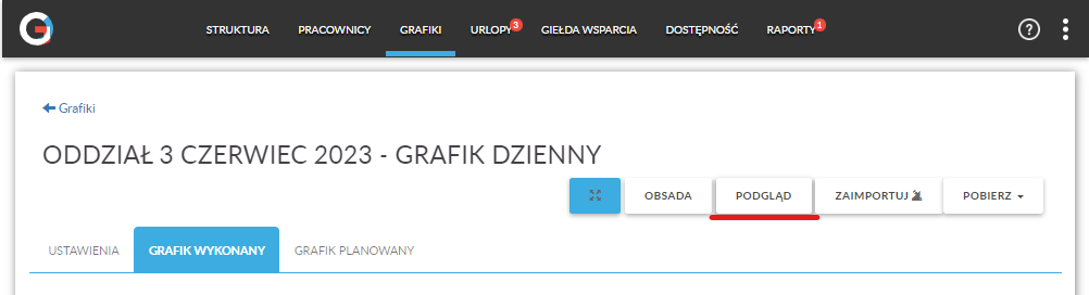 Podgląd został wprowadzony do widoku bezpośrednio na grafiku. Pokazuje on dane zarówno z grafiku planowanego jak i wykonanego, w zależności od tego, na której zakładce się znajdujesz.